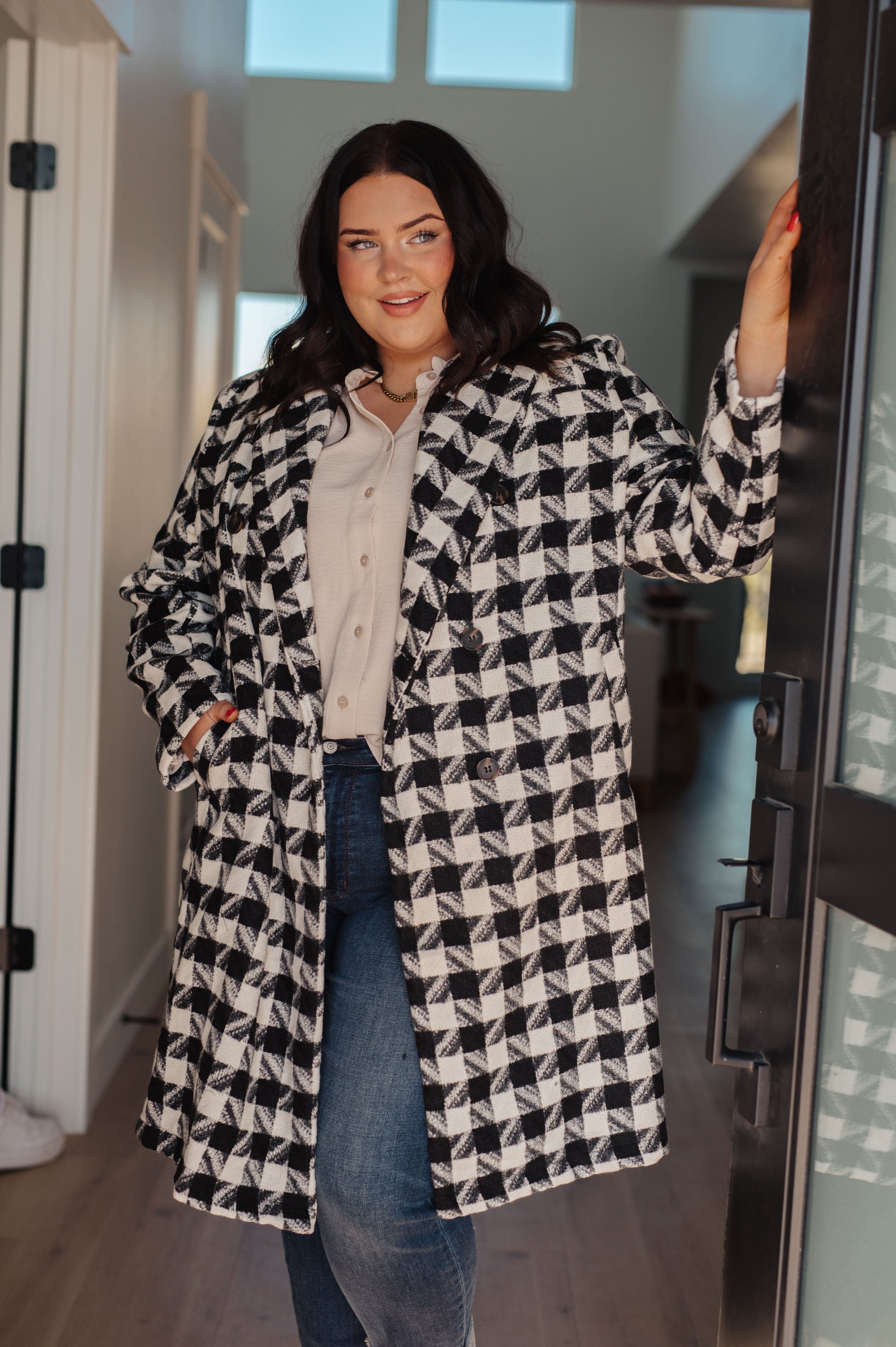 This Monochromatic Moment Houndstooth Coat is the perfect winter jacket. Crafted from a light-to-mid weight fabric with no stretch, it offers stylish comfort and functionality. Enjoy the warmth of the plaid fabric and the convenience of functional pockets and a functional button closure. Stay cozy all season long!