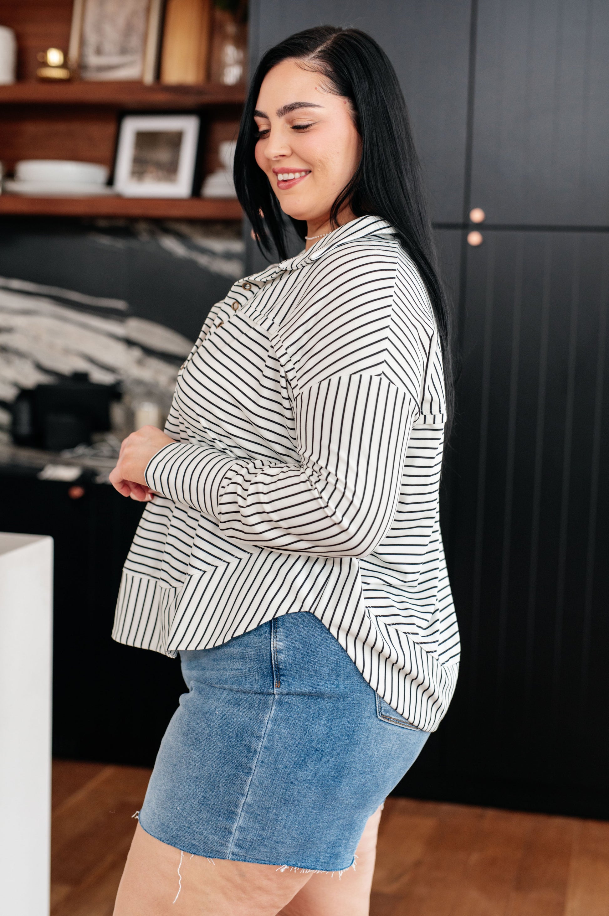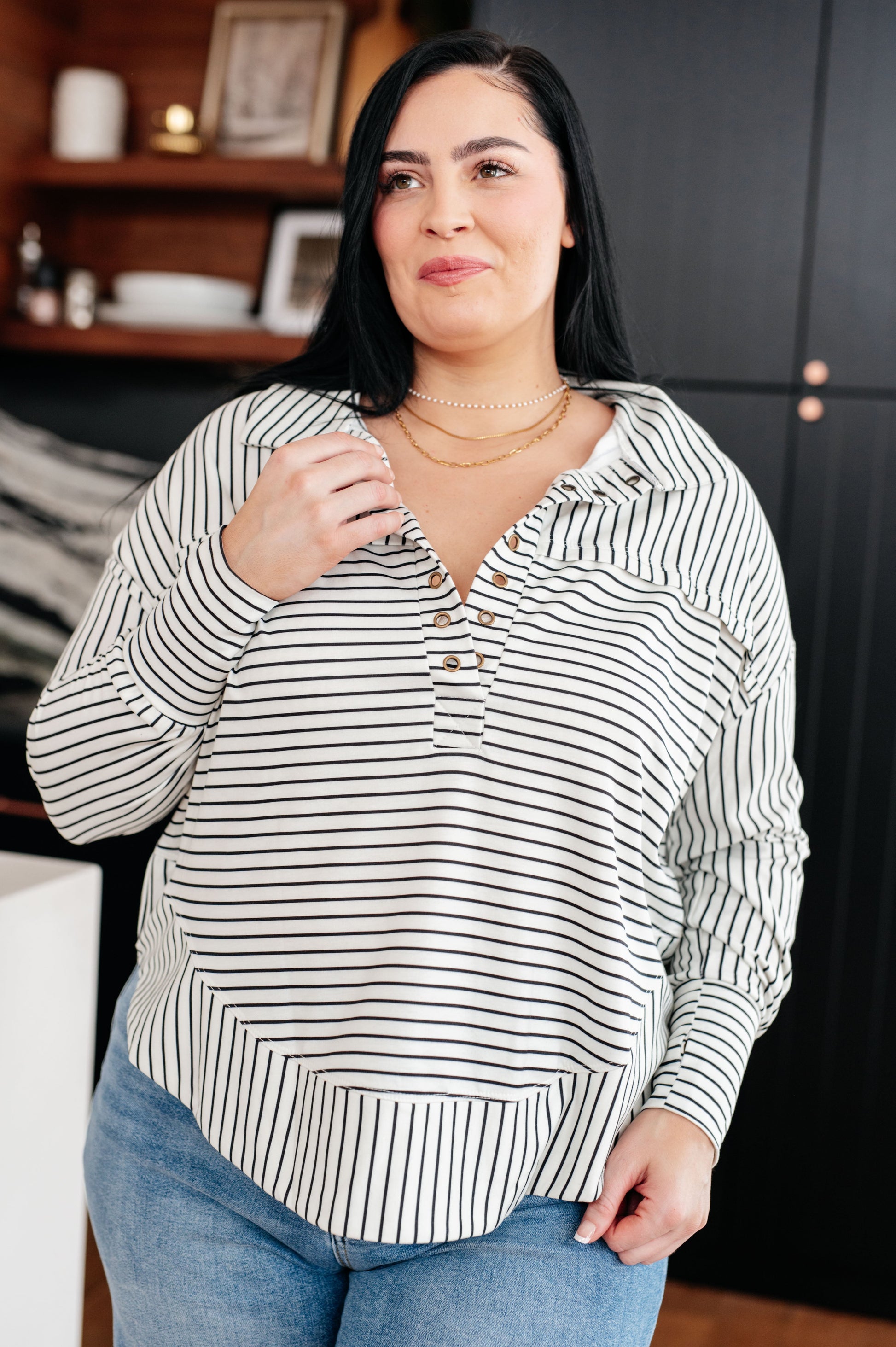 Serendipitously cozy, this Striped Serendipity Pullover features a collared neckline and exaggerated banded cuffs with grommet details. The thumb holes and scoop hem add extra function and flair to this playful jersey knit sweater. Perfect for a playful yet stylish look!
